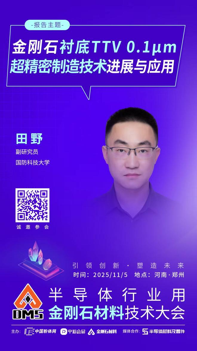2025年11月5日,中國粉體網將在河南•鄭州舉辦“2025半導體行業用金剛石材料技術大會”。屆時,我們將邀請到國防科技大學副研究員田野出席本次大會并作題為《金剛石襯底TTV 0.1μm超精密制造技術進展與應用》的報告。報告將聚焦金剛石等超硬襯底的原子級表面平坦化制造,圍繞新型離子束流平坦化工藝,分享技術進展與成果。