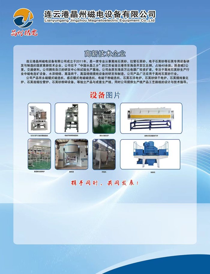 連云港晶州磁電設(shè)備有限公司成立于2011年,是一家專業(yè)從事高純石英砂、拉管石英砂、電子石英砂等石英專用設(shè)備研發(fā)與制造的國(guó)家高新技術(shù)企業(yè),公司位于“中國(guó)水晶之鄉(xiāng)”的江蘇省連云港市東海縣開(kāi)發(fā)區(qū)北側(cè),占地40余畝。公司擁有自己的研發(fā)中心和試驗(yàn)生產(chǎn)基地,專注于高純石英砂生產(chǎn)行業(yè)中磁電選礦設(shè)備、水淬焙燒、高溫烘干、高溫 焙燒氯化提純?cè)O(shè)備的研發(fā)和制造,公司產(chǎn)品廣泛應(yīng) 用于高純石英砂行業(yè)。公司于2024年投產(chǎn)年生產(chǎn)5000萬(wàn)噸高純超高純石英砂生產(chǎn)線。