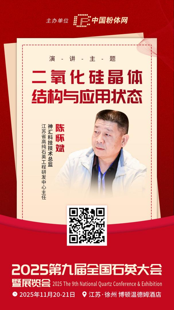 2025年11月20-21日,中國粉體網將在江蘇徐州舉辦“2025(第九屆)全國石英大會暨展覽會”。屆時,江蘇省高純石英工程研發中心主任/神匯科技技術總監陳懷斌,將帶來題為《二氧化硅晶體結構與應用狀態》的報告。他將深入解讀二氧化硅晶體結構與應用狀態,為行業提供從理論到實踐的參考。