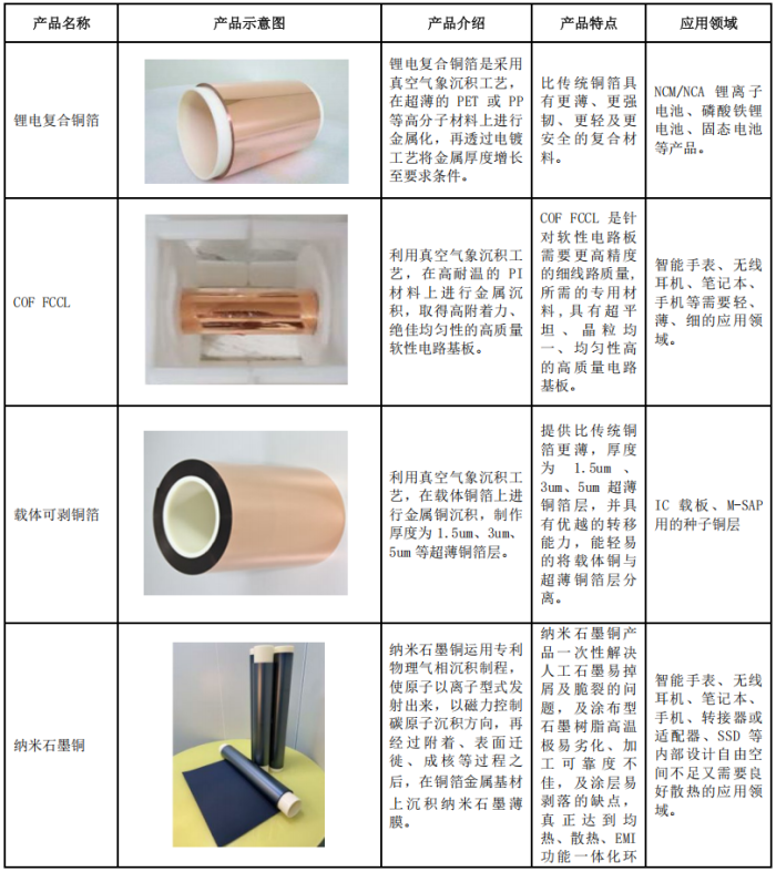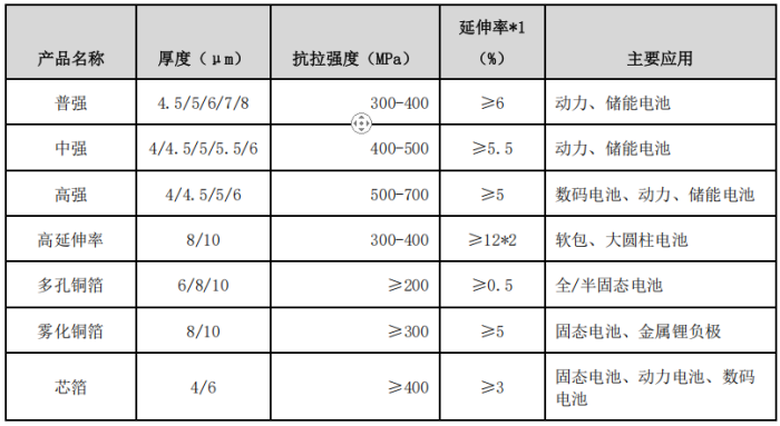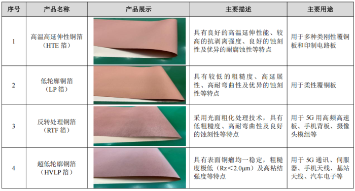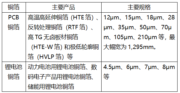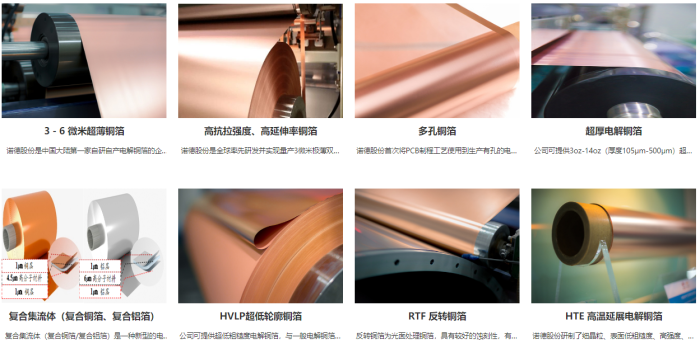 電子電路銅箔:主要為中高Tg-高溫高延伸銅箔(HTE)以及高密度互連(HDI)線路板用銅箔,規格覆蓋10μm—210μm等主流產品。