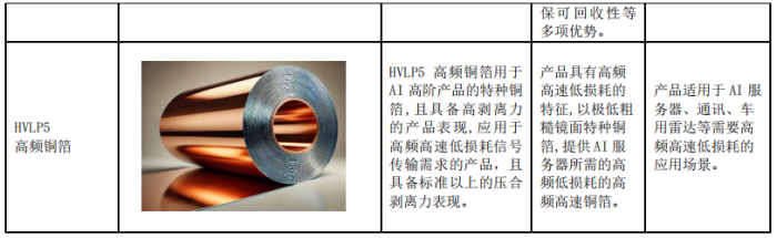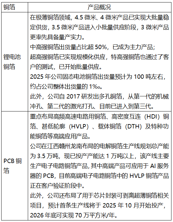 此外,公司應用于半/全固態電池的鋰電銅箔已實現百噸級批量出貨;通過自主創新研發,公司已成功研發出3.5μm超薄銅箔、多孔結構銅箔、霧化銅箔以及芯箔等新型產品,并實現向多家下游客戶樣品測試及批量供應。