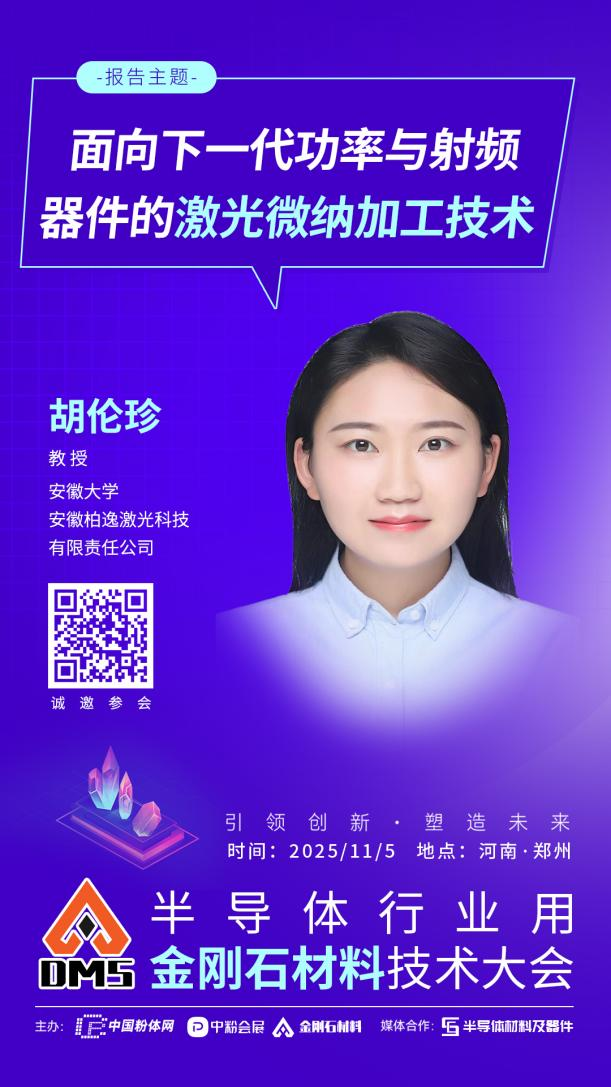 2025年11月5日,中國粉體網將在河南•鄭州舉辦“2025半導體行業用金剛石材料技術大會”。屆時,我們將邀請到安徽大學胡倫珍教授出席本次大會并作題為《面向下一代功率與射頻器件的激光微納加工技術》的報告。