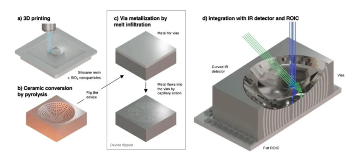 休斯研究實驗室(由波音與通用汽車聯(lián)合創(chuàng)立的前沿技術(shù)研發(fā)機構(gòu))采用摩方microArch® S230高精度3D打印系統(tǒng),成功制備出具有微米級通孔陣列的陶瓷中介層。該技術(shù)實現(xiàn)了通孔直徑9μm、間距18μm的突破性指標,并通過創(chuàng)新的熔融滲透金屬化工藝,構(gòu)建了高密度互連的電氣通路。這項技術(shù)不僅攻克了傳統(tǒng)高溫共燒陶瓷的結(jié)構(gòu)限制,重新定義了微電子系統(tǒng)的集成模式,還顯著縮小了實心孔尺寸,通過3D打印技術(shù)重構(gòu)了微電子封裝的底層邏輯,為陶瓷封裝領(lǐng)域開辟了全新的技術(shù)路徑。