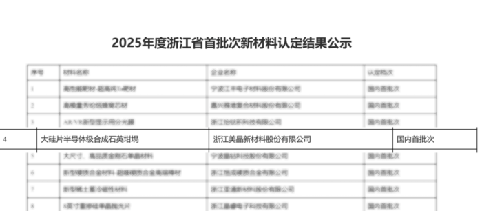 中國粉體網訊 近日,浙江省經信廳公示《2025年度浙江省首批次新材料清單》,浙江美晶新材料股份有限公司研發的“大硅片半導體級合成石英坩堝”成功入選,認定檔次為“國內首批次”。