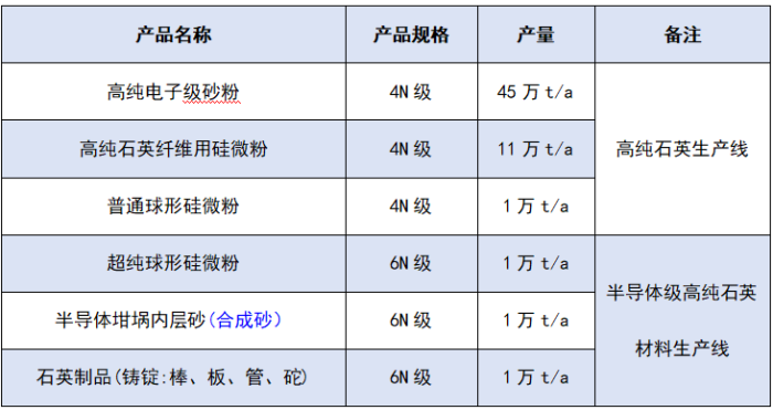 項目達產后將形成年產45萬噸4N級高純電子級砂粉、11萬噸高純石英纖維用硅微粉、1萬噸普通球形硅微粉、1萬噸超純球形硅微粉、1萬噸半導體坩堝內層砂(合成砂)、1萬噸石英制品(鑄錠:棒、板、管、砣)的生產規模。