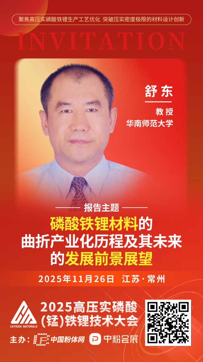 中國粉體網將于2025年11月26日在江蘇·常州舉辦“2025高壓實磷酸(錳)鐵鋰技術大會”。本屆大會將聚焦高壓實磷酸鐵鋰生產工藝優化、突破壓實密度極限的材料設計創新、錳溶出問題的終極解決方案,以及從實驗室到量產的全鏈條工藝優化等議題展開交流討論!屆時,來自華南師范大學的舒東教授將作題為《磷酸鐵鋰材料的曲折產業化歷程及其未來的發展前景展望》的報告。舒東教授將結合磷酸鐵鋰材料的本征性質和國家產業政策的變化,講述材料發展的曲折歷程,并展望其未來發展前景。