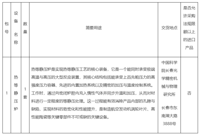 項(xiàng)目名稱(chēng):中國(guó)科學(xué)院長(zhǎng)春光學(xué)精密機(jī)械與物理研究所熱等靜壓爐采購(gòu)項(xiàng)目