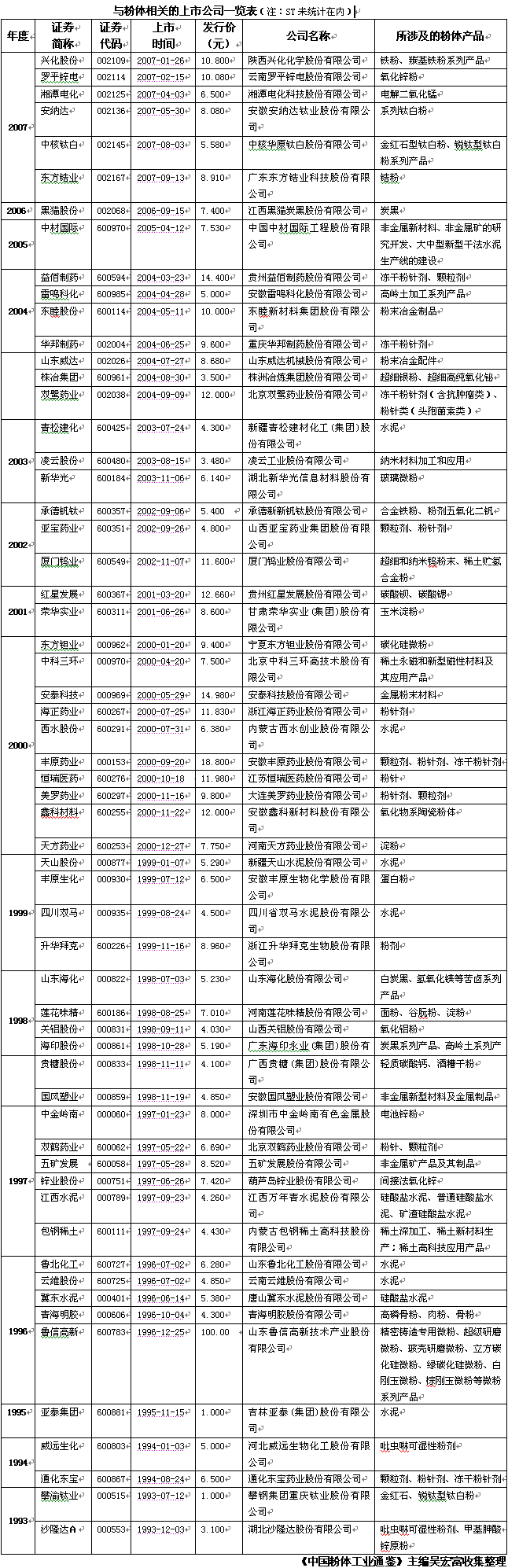 “無細不成體,有粉能為材”。這是我國著名材料專家、原國際材聯主席李恒德院士高度評價粉體技術對于材料工業的重要性。超微粉體是許多新材料的基礎材料,廣泛應用于化工、冶金、礦業、建材、日化、食品、醫藥、農業、環保和航空航天等國民經濟的各個領域,為上市公司所青睞。據不完全統計,截止2008年3月,在目前我國上海證券交易所和深圳證券交易所1600家左右的上市公司中,約有60家上市公司的產品涉及粉體種類。