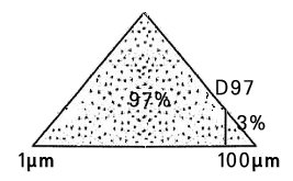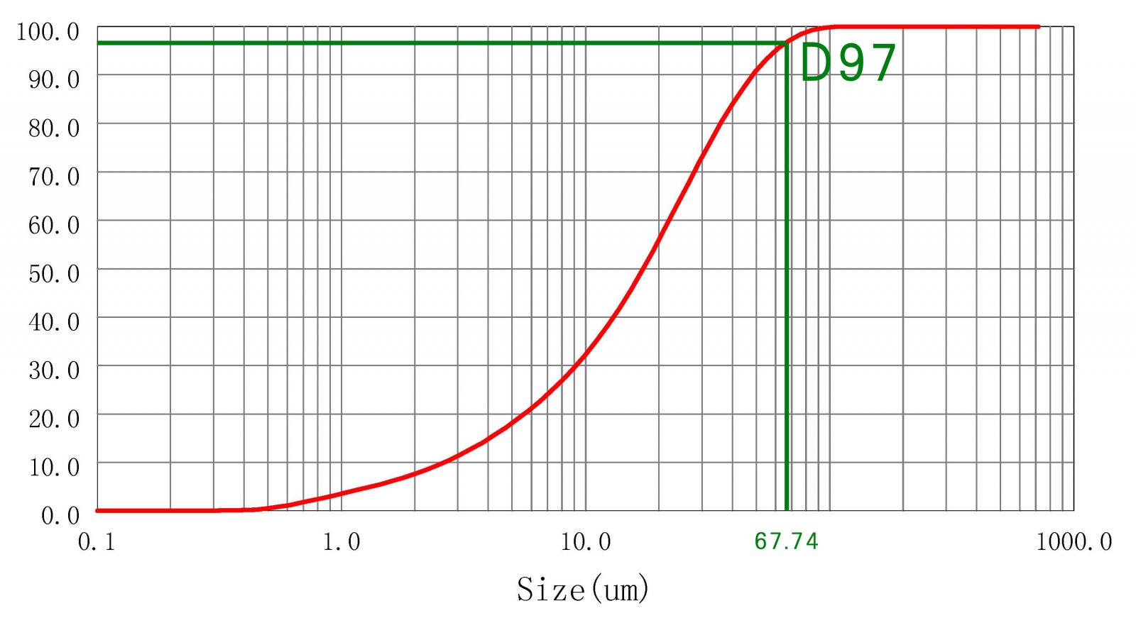 D97是指累積分布百分數達到97%時所對應的粒徑值。 就是說粒徑小于 D97 的顆粒占總量的97%,大于D97的占 3%。D97通常被用來表示粉體粗端粒度指標,是粉體生產和應用中評價粗端的典型指標。有的行業(yè)采用D95、D98來表示粉體粗端粒度指標。