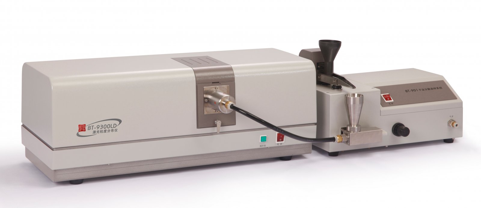 釹鐵硼顆粒帶有較強的磁性,極易團聚,因此不能用濕法測試。而干法是通過高速氣流瞬間分散,可以克服磁性引起的團聚,因此干法激光粒度儀成為測量釹鐵硼的粒度分布的典型方法。但是由于釹鐵硼粉在空氣中具有自燃性,就是暴露在空氣中的釹鐵硼粉在環(huán)境溫度稍高時就會自燃,因此常常會燒毀吸塵器管路和濾網(wǎng),使粒度測試無法正常進行,并且容易帶來危險。采取的預(yù)防措施一是不用壓縮空氣作為氣源,而用氮氣等惰性氣體作氣源;二是要將吸塵器管更換成表面光滑的聚乙烯管,使顆粒不在管路中沉積;三是要選用水過濾的吸塵器收集樣品而不能選用袋式過濾吸塵器收集樣品。