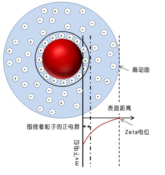 分散在液體(特別是水)中的顆粒對液體中離子有選擇性吸附作用,加上固液兩相對電子的親和性不同,往往致使顆粒表面帶電。帶電顆粒周圍的溶液中將富集帶相反符號的離子(即反離子),其中一部分反離子與顆粒表面緊密結合,構成固定吸附層,或稱 Stern 層,另一部分反離子由于靜電吸引和熱擴散兩種相反作用的平衡,分布在顆粒周圍溶液中,與顆粒一起構成所謂的擴散雙電層。如果對這種固 - 液分散體系施加一個直流電場,則帶電顆粒將向相反電性的電極方向作定向運動,此即電泳現象。帶電的顆粒表面與溶液內部的電位差稱為顆粒的表面電位,它使顆粒做電泳運動時,會帶著固定吸附層和部分(與顆粒表面緊密結合的)溶劑分子一起運動,與液體之間形成滑動面,此滑動面與液體內部的電位差被稱為 Zeta 電位。Zeta 電位通常利用電泳方法測量,即帶電的顆粒在電場作用下運動,其運動速度(稱電泳速度)與 Zeta 電位呈正比關系,由此可以計算出 Zeta 電位。