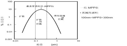 這幾種過濾機(jī)制中,顆粒越小時(shí),1、4沉積效應(yīng)越強(qiáng),顆粒越大時(shí),2、3效果越好。也就是說并不是顆粒越小攔截效果越差,也不是顆粒越大攔截就越容易,下圖是綜合4種過濾機(jī)制的協(xié)同作用下濾料穿透率和粒徑關(guān)系圖。