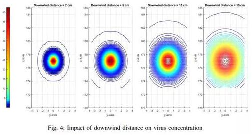 可以發(fā)現(xiàn),隨著中心位置的拉大,病毒濃度迅速下降。這一點(diǎn)說明,在開放空間可能含有病毒的氣溶膠顆粒會(huì)迅速擴(kuò)散,只要保持良好的通風(fēng)狀態(tài)和做好防護(hù)措施,氣溶膠的感染風(fēng)險(xiǎn)極低。
