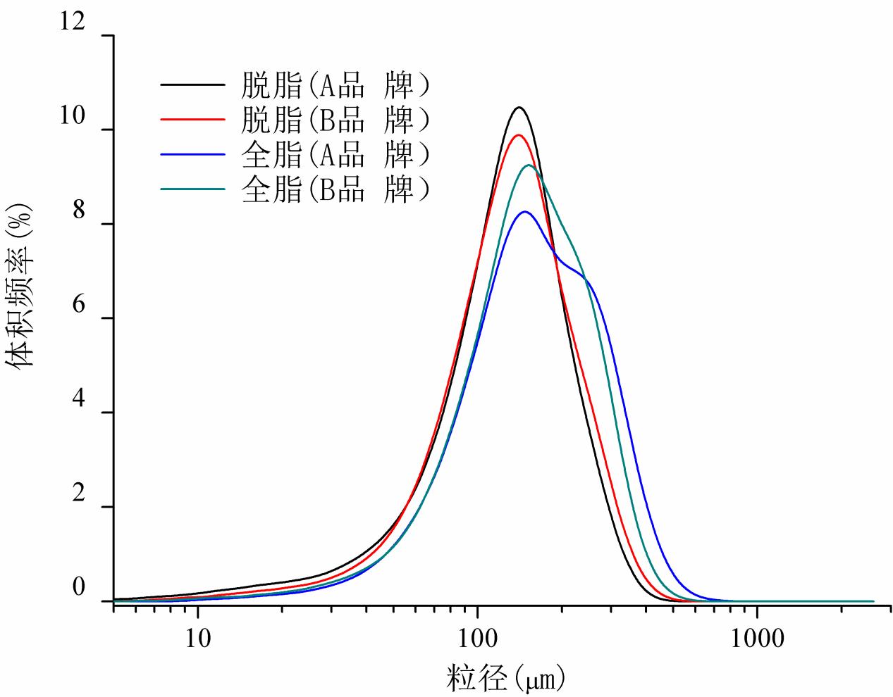 在乳粉的生產(chǎn)過程中,使用激光粒度儀能精確地評(píng)估乳粉的粒度。本文通過選擇不同品牌(A品牌和B品牌)的脫脂乳粉和全脂乳粉,考察乳粉脂肪含量的差異對(duì)乳粉粒度分布的影響。