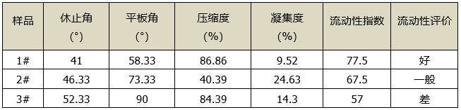我們選取3個粒度和顆粒形貌均不相同的樣品,先采用卡爾流動性指數(shù)法測試它們的流動性,測試結(jié)果如下。