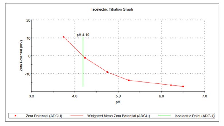 OMEC系列納米和電位分析儀對Zeta電位等電點的測試,可以配置不同pH樣品分別測試,將結果進行曲線制圖,查找等電點數據。更常用的方式則是使用MPT多用途滴定附件遵循儀器軟件的測量步驟設置快速自動執行pH滴定測試。待測試結束后,在結果分析頁面,可以數據表和圖形形式查看滴定結果,并獲取等電點的數據。