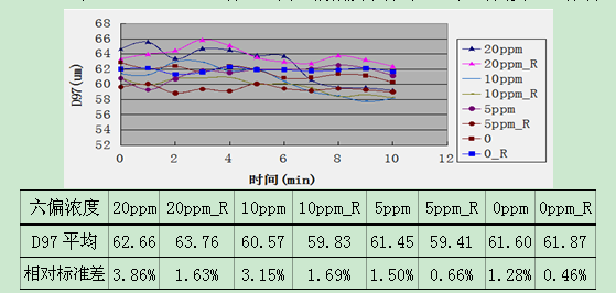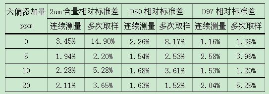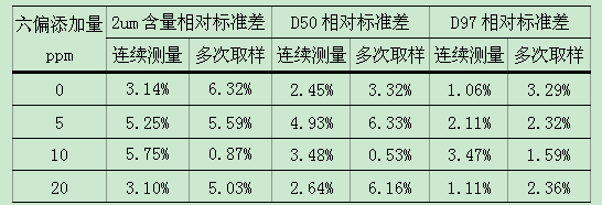 表1:SFC-105B進(jìn)樣器,加入不同量六偏磷酸鈉D10、D50、D97測量相對均方差