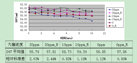 表5:SFC-105B進(jìn)樣器不同六偏濃度條件對D97隨時間變化的影響