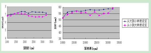 在加入10ppm六偏,加樣超聲2min后,分別設(shè)定進(jìn)樣器離心泵轉(zhuǎn)速從3200rpm逐次下降至1000rpm后,再逐次升高離心泵轉(zhuǎn)速至3200rpm,將兩段所得到的D97,D50參數(shù)進(jìn)行趨勢分析。