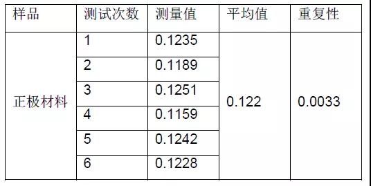如表2取鈷酸鋰樣品進(jìn)行重復(fù)性測(cè)試,如此的小的比表面積重復(fù)性高達(dá)0.0033 m2/g,遠(yuǎn)小于標(biāo)稱0.01 m2/g,完美解決了鈷酸鋰在測(cè)試中,傳統(tǒng)儀器本身系統(tǒng)誤差在0.05 m2/g以上,對(duì)0.1 m2/g的比表面積來(lái)說(shuō),超過(guò)50%以上波動(dòng),測(cè)試數(shù)據(jù)無(wú)法作為品控依據(jù),新一代的DX400解決了這個(gè)老大難問(wèn)題,實(shí)現(xiàn)了超小的波動(dòng)。