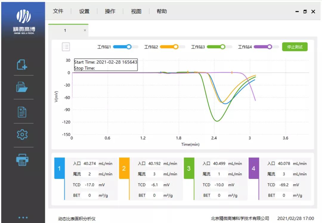 全新開(kāi)發(fā)的DX 400控制軟件是在Windows平臺(tái)上實(shí)現(xiàn)操作控制、數(shù)據(jù)采集、計(jì)算分析和報(bào)告預(yù)覽的智能化軟件。測(cè)試界面上動(dòng)態(tài)顯示每個(gè)樣品的吸附過(guò)程,吸附峰實(shí)時(shí)顯示,每個(gè)樣品的BET比表面積實(shí)時(shí)計(jì)算。