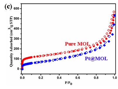 由上圖可以看出,金屬有機(jī)框架材料經(jīng)過貴金屬的負(fù)載之后,占據(jù)了金屬有機(jī)框架的孔道,微孔減少和比表面下降。