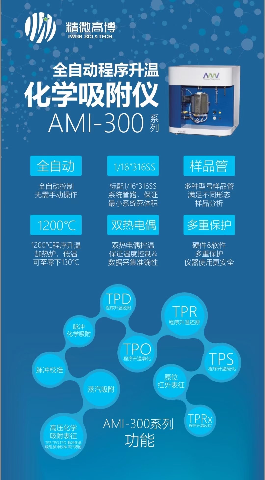 AMI-300化學吸附儀是AMI儀器公司提供的最新一代全自動化學吸附分析儀器。該儀器均是基于無人值守理念設計的全自動催化表征儀器,具有高可靠性的獨立控制軟件,及完善的數據處理軟件,最先由催化劑研究人員開發并為催化劑研究人員服務的化學吸附儀,它和它的前身AMI-1,AMI-100和AMI-200,是業內第一個提供全自動分析測試的化學吸附儀,該儀器能夠為表征催化劑提供必要動力學參數。