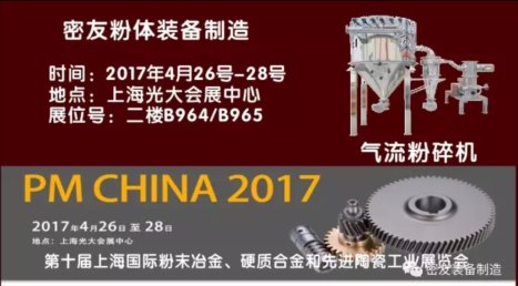 2017第十屆上海國際粉末冶金、硬質合金與先進陶瓷展覽會將于4月26—28日在上海光大會展中心舉行。密友粉體裝備制造攜氣流粉碎機參加此次展會。