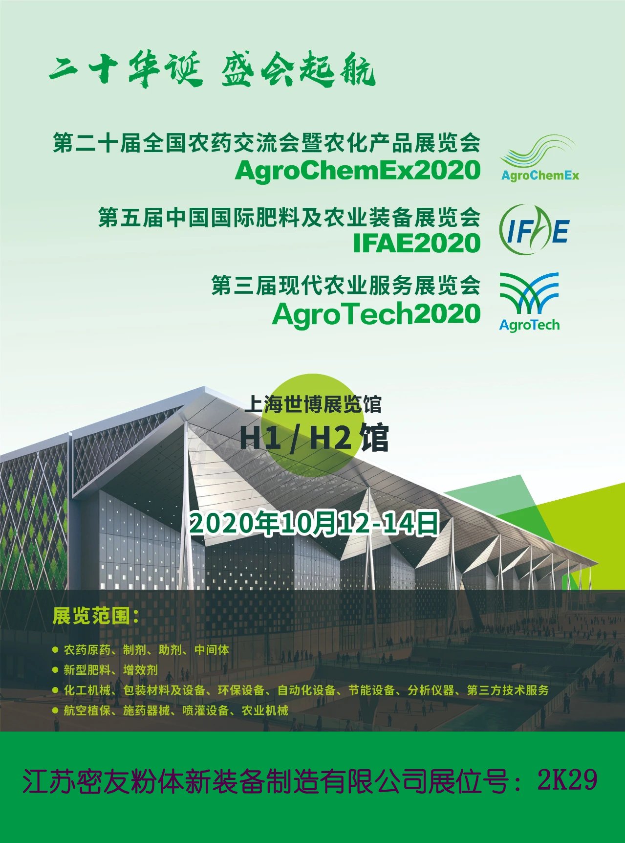 全球農化行業年度盛會,“第二十屆全國農藥交流會暨農化產品展覽會、第五屆中國國際肥料及農業裝備展覽會、現代農業服務展覽會”將于10月12-14日在上海世博館隆重舉辦。江蘇密友粉體新裝備制造有限公司與600多家農化行業企業一道齊聚上海,共襄盛會。