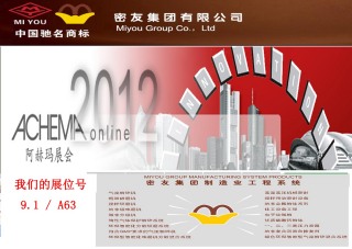 第30屆國際化學工程、環境保護和生物技術展——阿赫瑪展ACHEMA 2012,將于2012年6月18日至22日在德國法蘭克福展覽中心隆重開幕。阿赫瑪展,每三年一次,來自世界五大洲的近4,000家參展商、來自100個國家的18萬參與者和來自高級管理層面的3萬名經理人員, 用他們的行動證明了,阿赫瑪是流程工業的世界論壇,是化學工程、環境保護和生物技術的最高峰會。