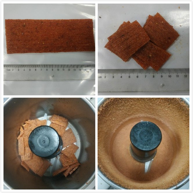 GM200的最大進樣尺寸40mm,GM300最大進樣尺寸130mm。對于辣條樣品來說,如果原始樣品的尺寸過大,可以先用剪刀對樣品剪成儀器要求的進樣尺寸。然后使用液氮對辣條進行脆化處理同時可對熱敏性成分進行保護,最后使用GM系列刀式研磨儀10s內即可實現非常好的粉碎處理效果。如圖為辣條樣品整個研磨過程,其中使用的是GM200刀式研磨儀,8000r/min、10s即可實現對辣條樣品的粉碎混勻。