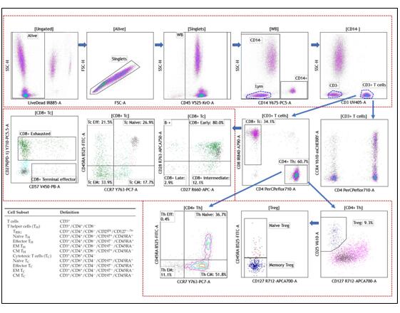 Dr. Ravi Mylvaganam采用20個(gè)熒光抗體以及一個(gè)細(xì)胞死活染料組成21色的panel,可同時(shí)檢測(cè)多群記憶、效應(yīng)T細(xì)胞,調(diào)節(jié)性T細(xì)胞,NK細(xì)胞甚至是干細(xì)胞樣T細(xì)胞等細(xì)胞亞群,詳細(xì)的抗體和染料標(biāo)記如下所示:
