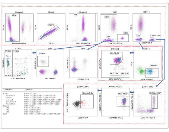 我們知道流式實(shí)驗(yàn)中抗體標(biāo)記的數(shù)量越多得到的信息就越詳細(xì)和準(zhǔn)確,以此同時(shí),實(shí)驗(yàn)操作也變得更加復(fù)雜。多色流式實(shí)驗(yàn)中的補(bǔ)償操作,一直以來(lái)都是流式使用者非常關(guān)心的問(wèn)題。甚至有人認(rèn)為,由于目前熒光染料的光譜普遍比較寬,可能會(huì)在相鄰的多個(gè)通道都造成比較大的干擾,因此很難在流式上完成超過(guò)18色以上的實(shí)驗(yàn)。事實(shí)是否真是這樣呢?恰巧哈佛醫(yī)學(xué)院附屬麻省總醫(yī)院的Dr. Ravi Mylvaganam與我們分享了他在6激光21色的CytoFLEX LX上做的一個(gè)多色實(shí)驗(yàn)。我們一起來(lái)看看。