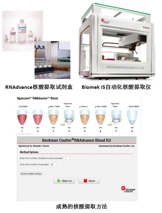RNAdvance系列提取試劑盒能夠從血液、鼻拭子、咽拭子、深咳痰液及肺泡灌洗液等臨床樣本中提取病毒RNA。它應用于丙型肝炎病毒RNA,流感病毒,登革熱病毒等多種類型病毒的核酸提取。貝克曼SPRI磁珠技術在保證核酸產率和純度的同時,兼容提取結果的穩定性及自動化的高通量實驗,適合從疾控中心到醫院檢驗科各種檢測通量的靈活需求。