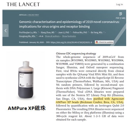 基因測序也是官方診療方案中認可的確診方式。在本次新型冠狀病毒疫情的爆發中,基因測序為我們確定病原體,及時研發診斷試劑盒做出了很大的貢獻。基因測序對動態監控病毒的變異也意義重大。針對新冠病毒宏基因組測序樣品,小貝提供從RNA提取、去宿主核酸處理到文庫構建的單步驟自動化方案和自動化整體方案,助你完成高通量的mNGS文庫實驗。小貝還有NGS實驗產物純化、片段選擇的金標準——AMPure XP和SPRIselect磁珠產品。1.29日柳葉刀發表的新型冠狀病毒論文中即使用了AMPure XP磁珠進行相關文庫構建實驗。