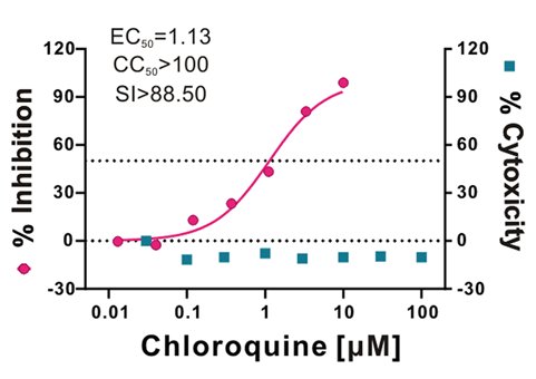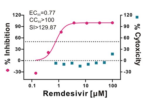 近日,我國(guó)研究人員評(píng)估了幾種廣譜抗病毒藥物對(duì)新型冠狀病毒SARS-Cov-2的抑制作用。1細(xì)胞實(shí)驗(yàn)發(fā)現(xiàn),瑞德西韋和鹽酸氯喹的半數(shù)有效濃度EC50分別為0.77 uM和1.13 uM,