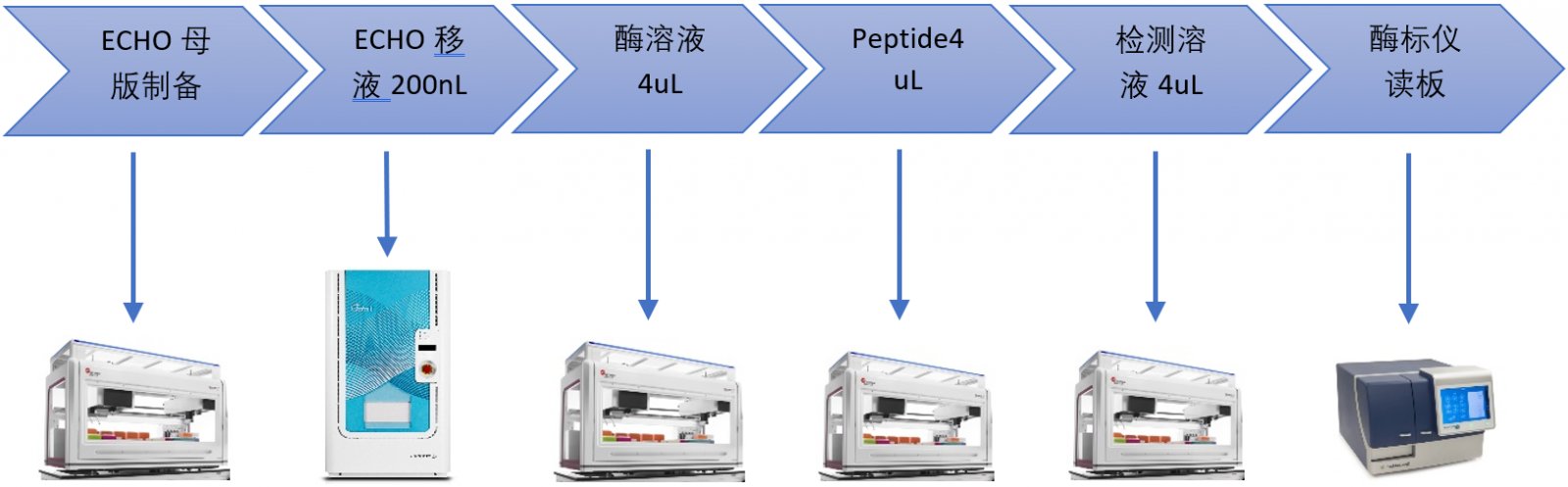 在一個簡單的新藥篩選HTRF實驗中,利用Biomek自動化移液工作站將化合物轉移到ECHO母版中,再利用ECHO聲波移液技術將200nL化合物轉移到assay plate,利用移液工作站分裝反應液4uL和檢測液4uL,最后去檢測儀檢測。過程中因為使用了ECHO納升移液的技術,簡化了化合物處理過程,化合物無需稀釋,直接加到反應體系里面,簡化了實驗步驟。Biomek移液工作站的加入使得反應試劑的分裝自動化,提高實驗準確性。