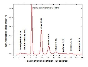 掃描得到沉降數(shù)據(jù)后,通過后續(xù)軟件分析可得到樣品表征結(jié)果,目前普遍應(yīng)用SEDFIT/SEDPHAT分析軟件。下圖為沉降速率數(shù)據(jù)分析擬合后得到的c(S)分布圖,根據(jù)分析結(jié)果可精準(zhǔn)檢測生物大分子聚集狀態(tài)以及聚集體準(zhǔn)確百分比含量。