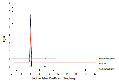 以阿達木單抗類似物為例,安進公司研發的ABP501成為首個FDA批準的Humira類似物。在其提交的上市申請中,使用分析型超速離心技術對阿達木單抗類似藥ABP501進行了聚集體的定性和定量分析。同時檢測ABP501、美國市場Humira與歐洲市場Humira,根據AUC圖譜確定其相似性。另外,根據AUC數據結果,證明單體、聚體溶液中百分含量接近,從而確定類似藥與原研藥的一致性。