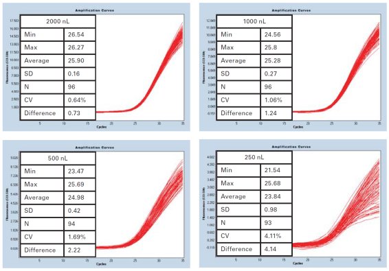 定量 PCR (qPCR) 在廣泛的領域都有應用,包括在基因表達、基因分型和核酸提取,病毒檢測等多個領域。為確保高數據質量,在小體積的液體時必須特別精確和準確。使用Echo 液體處理器將轉移到 384 微孔板中的反應體積低至250納升。標準偏差低于 0.25 和CV少于2%,操作簡單。
