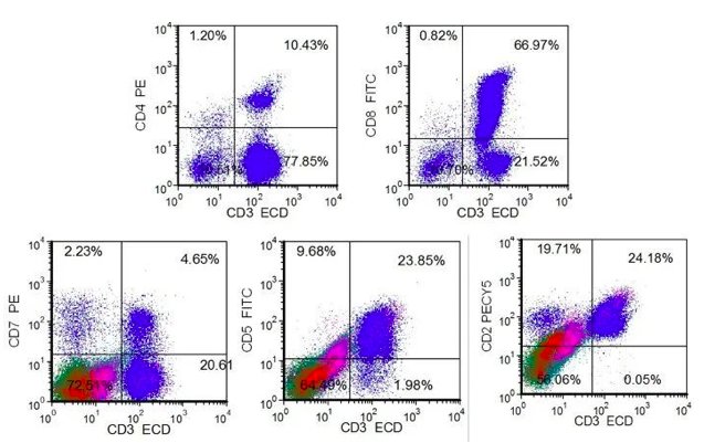 流式結果如下:未見明顯異常原始細胞,粒細胞相對比例減低,淋巴細胞相對比例升高,T 細胞 CD4 比 CD8 比值減小(0.21),CD8 陽性的 T 細胞分兩群,一群 CD3 和 CD8 較弱(同時 CD7 減弱,CD2 和 CD5 也可以有一定程度減弱),一群 CD3 和 CD8 較強(圖二)。