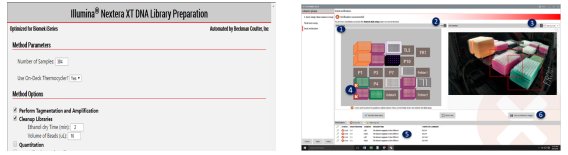 圖3.向?qū)降能浖僮鹘缑妫ㄗ螅团_面自動校對功能 (右)。如左圖所示,在軟件操作界面上用戶可以選擇樣本數(shù)量,是否使用臺面整合的PCR儀,以及運行工作流程的哪個部分。具備臺面自動校對功能(右圖),當操作人員完成耗材擺放后,工作站可自動判定耗材擺放是否正確,對錯誤擺放位置進行提示,確保程序運行前臺面擺放正確。避免由于人為擺放耗材錯誤,導致設備碰撞或試劑、時間損失。