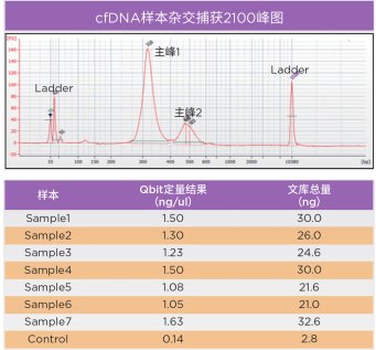 上圖: 片段分析,其中主峰1和2為雜交捕獲后cfDNA目標片段峰;
