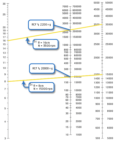 上圖轉(zhuǎn)速與半徑相對(duì)應(yīng)的離心力列線圖,左列為半徑標(biāo)尺,右列為轉(zhuǎn)速標(biāo)尺,連接半徑與轉(zhuǎn)速的直線與中間RCF 表尺的交匯點(diǎn),就可得到相對(duì)離心力。注意,若已知的轉(zhuǎn)數(shù)值處于rpm 標(biāo)尺的右邊,則應(yīng)讀取RCF 標(biāo)尺右邊的數(shù)值,轉(zhuǎn)數(shù)值處于rpm 標(biāo)尺左邊,則應(yīng)讀取RCF 標(biāo)尺左邊的數(shù)值。