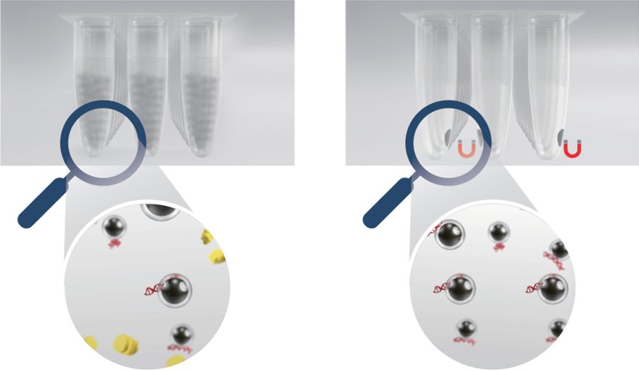 上圖為 EMnetik 24 和 EMnetik PCR 純化試劑盒的內部示意圖。左圖顯示試劑與樣品自動混合。EMnetik 24 系統利用電磁鐵混合樣品,無需移液混合。右圖顯示高響應性磁珠僅與樣品中的 DNA 結合。磁珠與樣品混合后,EMnetik 24 使用磁鐵將樣品吸至管側,以此便除去上清液中的污染物,僅留下與磁珠結合的樣品。DNA 可在水中洗脫下來。