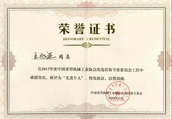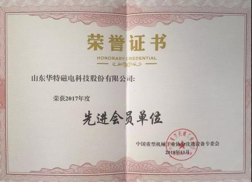 中國重型機械工業(yè)協(xié)會洗選設備專業(yè)委員會副理事長、鎮(zhèn)江電磁設備廠有限責任公司董事長楊鋼宣讀了2017年度優(yōu)秀單位及優(yōu)秀協(xié)會工作者的表彰決定,山東華特磁電科技股份有限公司被評為“2017年度先進會員單位”,董事長王兆連被評為“先進個人”。