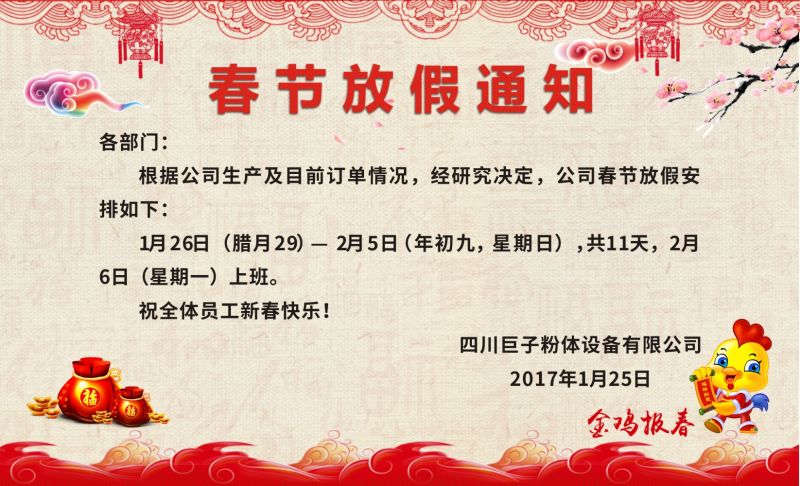 2017年春節將至為了方便新老客戶聯系公司了解產品,特別在此公告:四川巨子于1月26日至2月5日放假,2月6日上班。若給您帶來不便我們感到十分抱歉,盡請諒解。最后,四川巨子全體員工祝您和您的家人新年快樂,闔家幸福!