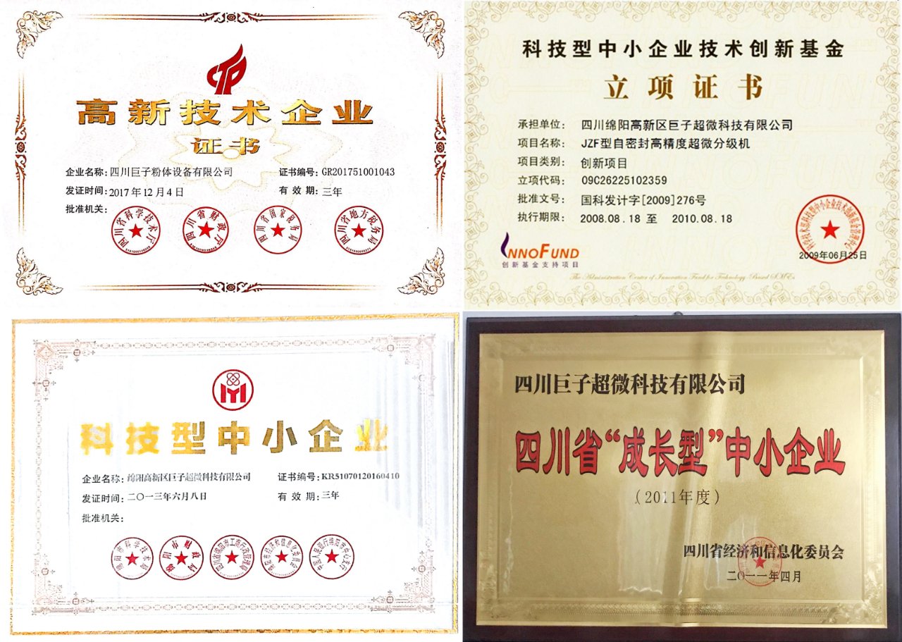在20年來的發(fā)展歷程中巨子公司形成了獨(dú)具特色的研發(fā)、銷售、生產(chǎn)及售后服務(wù)體系,在企業(yè)經(jīng)營、技術(shù)研發(fā)、文化建設(shè)和可持續(xù)發(fā)展方面成績斐然。公司于2008年順利通過ISO9000質(zhì)量體系認(rèn)證,現(xiàn)有的各系列粉碎分級設(shè)備能應(yīng)用于多種領(lǐng)域,可提供上萬種粉體系統(tǒng)工程解決方案;實(shí)現(xiàn)了行業(yè)的重大突破,為前沿科研用于民用開發(fā)探索出了一條新路徑。公司以技術(shù)起家,從2006年家被認(rèn)定為國家高新技術(shù)企業(yè)后連續(xù)順利通過高企復(fù)審,并被認(rèn)定為省市兩級知識產(chǎn)權(quán)試點(diǎn)企業(yè)、綿陽市重點(diǎn)知識產(chǎn)權(quán)保護(hù)單位、科技型中小企業(yè),2010年公司自主研發(fā)項目 “JZF型自密封高精度超微系列分級機(jī)”獲得了國家創(chuàng)新基金立項資助并順利通過驗(yàn)收。