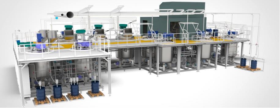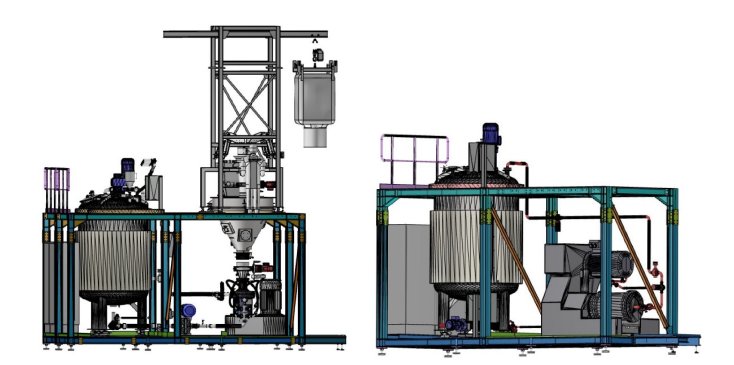 上圖顯示了兩個模塊。左邊的模塊由ψ-MIX在線混合系統和一個大袋進料站組合而成,整個粉體進料過程可以是密閉的,并配備精細除塵器。右邊的模塊為研磨裝置,由ZETA棒銷式研磨系統、儲料罐和泵組成。
