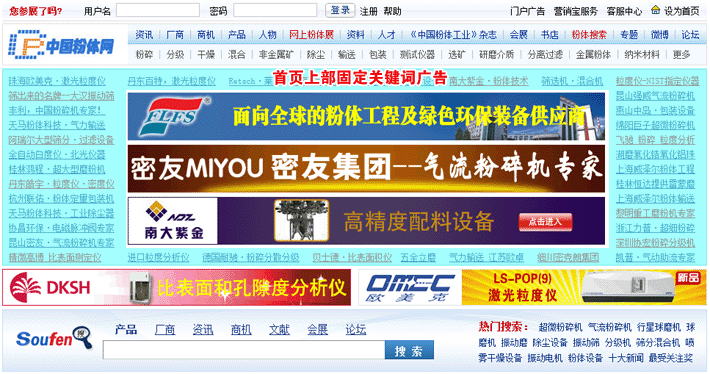 包含中國粉體網首頁個性關鍵詞服務、中國粉體搜索搜索關鍵詞排名服務,給企業創造更多被潛在客戶找到的機會。另外,關鍵詞推廣相對翻牌廣告費用較低,是相關企業宣傳推廣自己的產品、提高企業知名度的一種非常行之有效的方法。